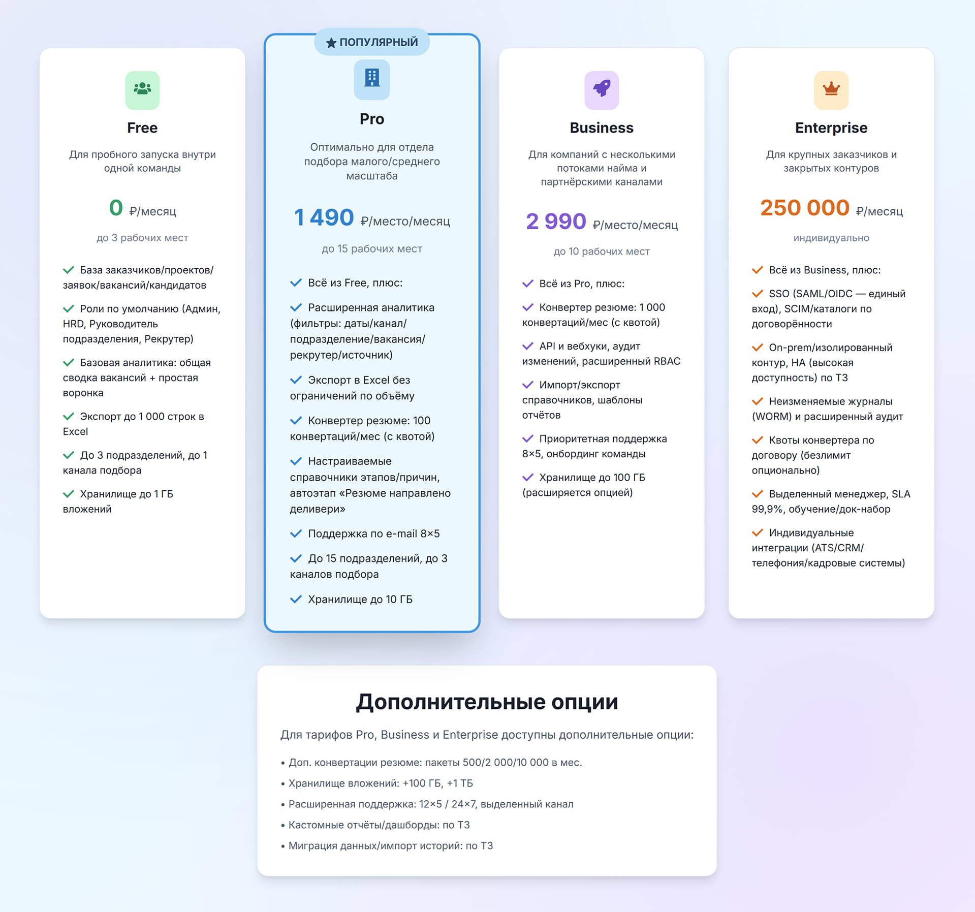 Аналитика – детальные отчеты по эффективности рекрутеров, статусам вакансий, скорости закрытия и другим ключевым метрикам